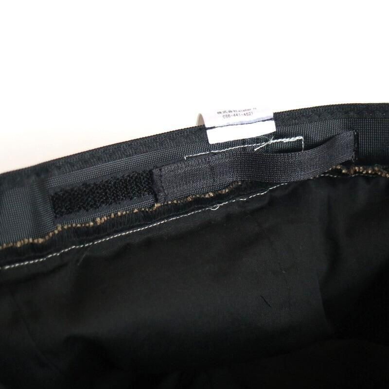 内側のネーム部分をめくったところにアジャスター(サイズ調節機能)が付いています。 サイズテープの中に一周リボンが通っていて、小さくすることが出来ます。 調節した後は全体に均等になるように馴染ませるとかぶり心地がよくなります。