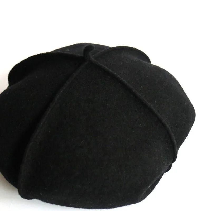 タックがポイントになり、自然に納まりの良い形になるので普段あまりベレー帽をかぶらない方にもおすすめです。生地をつまんだアクセントがシルエットをアシンメトリーにし、可愛らしくなりすぎないシックな雰囲気に決まります。
