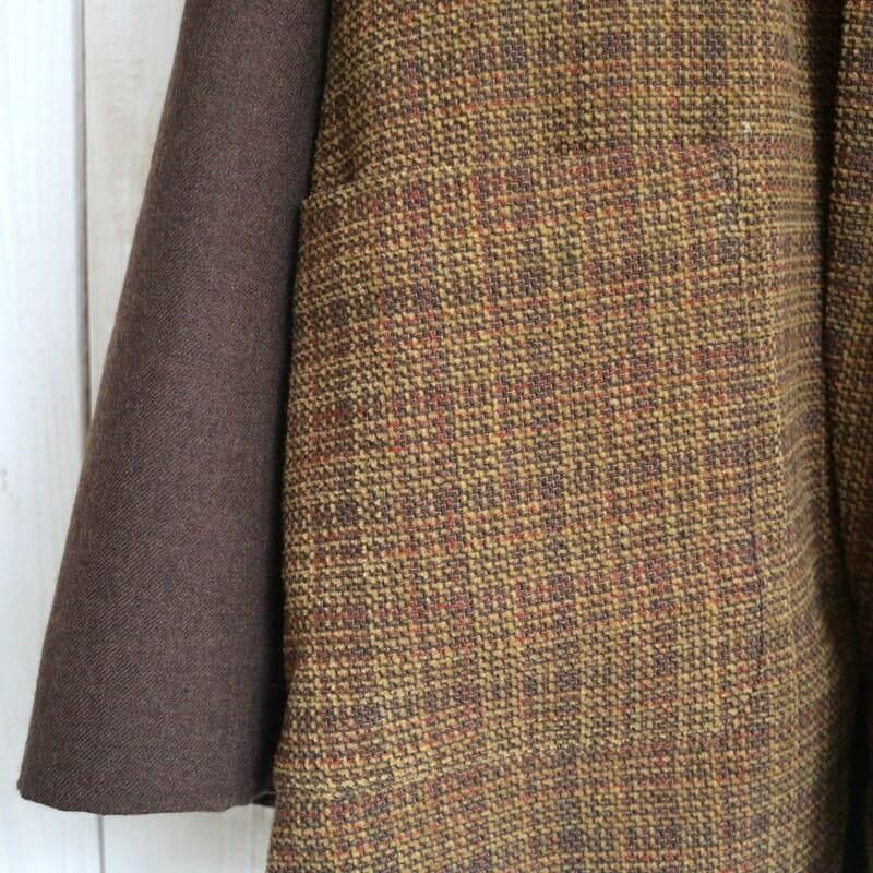 前身頃にはウール・コットン・ポリエステル・アクリル・ナイロンといった異素材の糸を織り合わせ、ソフトツイード調に仕上げられています。