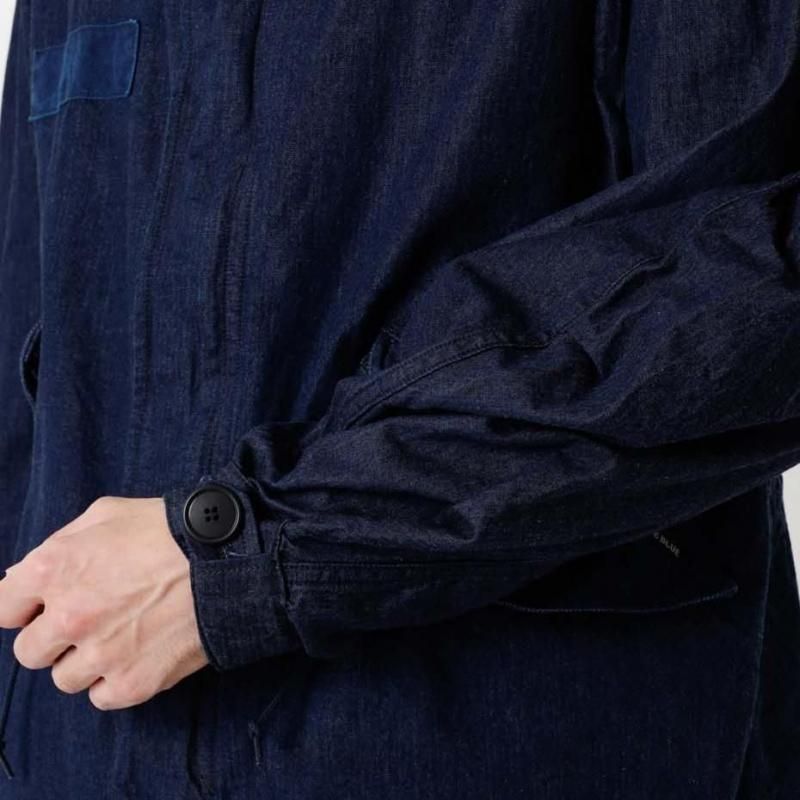 シルエットは当時のボリューム感を残しつつ、アームホールやポケット位置を調整して現代的にアップデート。無骨さの中に上品さを感じさせるバランスが秀逸です。インディゴ染めのコットンテープやステッチワークなど、細部にも職人の丁寧な仕事が光ります。